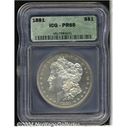 <B>1881<S$1> PR65 ICG.</B></I> This razor-sharp Gem is lightly toned in soft apricot hues. The devices exhibit moderate contrast with the mirrored fields, although the holder does not denote a Cameo designation. No hairlines are readily evident. This lovingly preserved specimen would be a standout in any collection of proof Morgans. Just 984 proofs were struck. <BR><BR><B>Important notice:</B> Heritage usually auctions material at the rate of 200-250 lots per hour. On some occasions eBay Live bid software or the Internet may not be able to keep up with the pace of the auction. We recommend placing a realistic absentee bid now as insurance to avoid disappointment. Occasionally the auctioneer may eliminate or reject an eBay Live bid, and the auctioneer may also reopen a lot after the close of the eBay live bidding (usually because we missed an audience bid), and may reject your bid even if it shows you as the winning bidder. By bidding via eBay Live, you agree that Heritage may award the lot to another bidder at its sole discretion under the circumstances described above or any other reasonable circumstances. Since eBay bids are not shown to us until we open the lot on the floor, we treat those bids just like floor bids. In most cases the floor responds before the eBay bid is presented to us, due to Internet lag time, so for consistency we have made it a policy that floor bids are always considered first over tie eBay live bids. Also please note that all Heritage lots purchased through eBay Live carry a 20% Buyer's Premium. Please make sure you read the Terms and Conditions before you bid. </span></font></tr></table></td></tr></table>