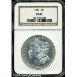 1881 S$1 PR65 NGC. A glassy, fully struck, untoned <B>1881 S$1 PR65 NGC.</B></I> A glassy, fully struck, untoned piece, this highly attractive specimen barely misses qualifying for the Cameo designation, due to a slight lack of frosting on the jaw. Subtle toning streaks cross Liberty's cheek, into the left obverse field, and minor rim damage accompanied by a straight-line abrasion is seen near twelve o'clock and two o'clock on the obverse. Still a lovely Gem proof Morgan dollar, and scarce as such. <BR><BR><B>Important notice:</B> Heritage usually auctions material at the rate of 200-250 lots per hour. On some occasions eBay Live bid software or the Internet may not be able to keep up with the pace of the auction. We recommend placing a realistic absentee bid now as insurance to avoid disappointment. Occasionally the auctioneer may eliminate or reject an eBay Live bid, and the auctioneer may also reopen a lot after the close of the eBay live bidding (usually because we missed an audience bid), and may reject your bid even if it shows you as the winning bidder. By bidding via eBay Live, you agree that Heritage may award the lot to another bidder at its sole discretion under the circumstances described above or any other reasonable circumstances. Since eBay bids are not shown to us until we open the lot on the floor, we treat those bids just like floor bids. In most cases the floor responds before the eBay bid is presented to us, due to Internet lag time, so for consistency we have made it a policy that floor bids are always considered first over tie eBay live bids. Also please note that all Heritage lots purchased through eBay Live carry a 20% Buyer's Premium. Please make sure you read the Terms and Conditions before you bid. This lot is being auctioned in conjunction with a live floor auction by Heritage Galleries & Auctioneers. All final auction and invoice information will be supplied by Heritage Galleries & Auctioneers, and all other information should be considered preliminary. Lot:7760