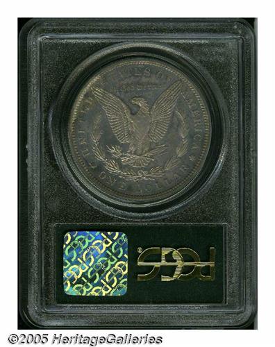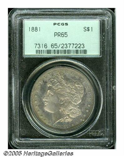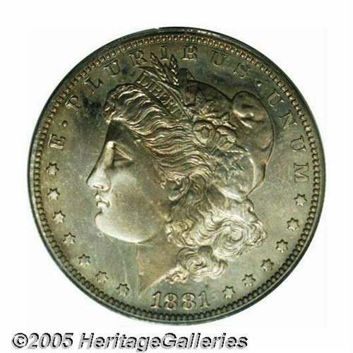 <B>1881<S$1> PR65 PCGS.</B></I> A lovely Gem with sharp satiny devices and glittering mirror fields. Virtually all design features are as sharp as could be desired. Delicately toned in intermingled shades of gold and blue. Here's one of the nicest survivors from a proof mintage of just 984 examples. Population: 12 in 65, 24 finer (3/05).