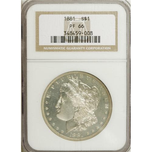 <B>1881 S$1 PR66 NGC.</B></I> A well-produced year in Morgan dollars and one that is often used for type purposes. The fields on this piece show illimitable depth of mirrored reflectivity with slight evidence of mint frost over the devices. Three tiny specks of grease are located in the center of the reverse, which were struck into the planchet at the time of manufacture. Mostly brilliant. Census: 24 in 66, 17 finer (4/07).<BR><BR><b>Shipping:</b> Coins & Currency (<a target="_blank" href="http://www.heritageauctions.com/common/shipping.php">view shipping information</a>)