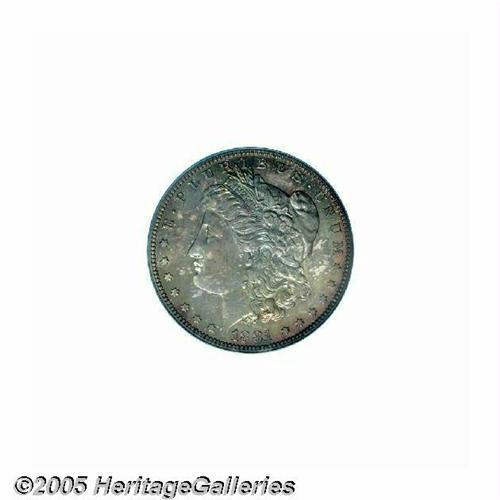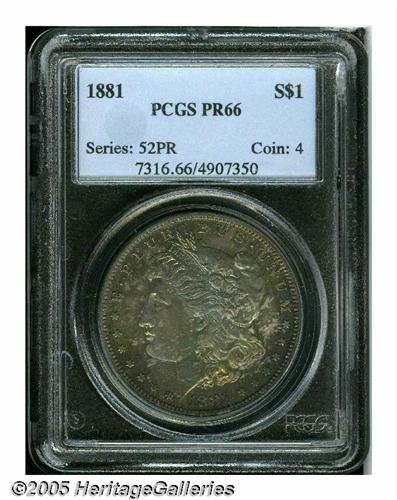 <B>1881<S$1> PR66 PCGS.</B></I> Deeply toned in mottled iridescent shades of magenta and turquoise, with a few flashes of bright blue about the margins. Pristine mirrored surfaces sparkle beneath this dramatic, if slightly irregular coloration. Population: 17 in 66, 7 finer (5/05).