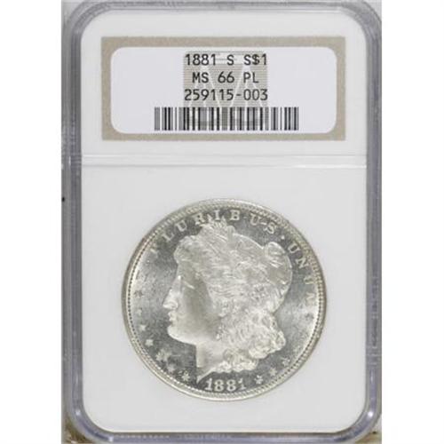 <B>1881-S $1 MS66 Prooflike NGC.</B></I> . NGC Census: (490/112). PCGS Population (480/65). Numismedia Wsl. Price for NGC/PCGS coin in MS66: $424. (#7131)<BR><BR><B>Coin Engraver:</B> George T. Morgan<BR><BR><b>Shipping:</b> Coins & Currency (<a target="_blank" href="http://www.heritageauctions.com/common/shipping.php">view shipping information</a>)