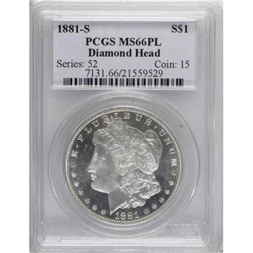 <B>1881-S $1 MS66 Prooflike PCGS.</B></I> Ex: Diamond Head. PCGS Population (475/64). NGC Census: (480/110). Numismedia Wsl. Price for NGC/PCGS coin in MS66: $424. (#7131)<BR><I>From The Diamond Head Registry Set of Prooflike Dollars.</B></I><BR><BR><B>Coin Engraver:</B> George T. Morgan<BR><BR><b>Shipping:</b> Coins & Currency (<a target="_blank" href="http://www.heritageauctions.com/common/shipping.php">view shipping information</a>\)