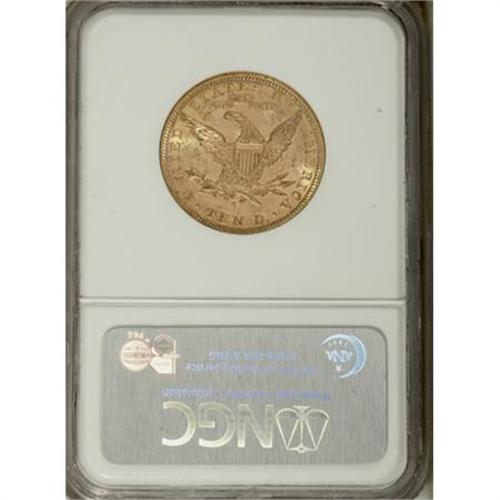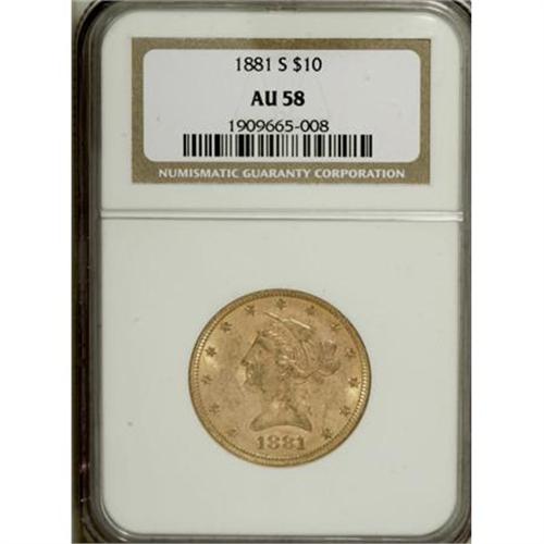 <B>1881-S $10 AU58 NGC.</B></I> NGC Census: (128/1407). PCGS Population (146/831). Mintage: 970,000. Numismedia Wsl. Price for NGC/PCGS coin in AU58: $360. (#8694)<BR><BR><B>Coin Engraver:</B> Christian Gobrecht<BR><BR><b>Shipping:</b> Coins & Currency (<a target="_blank" href="http://www.heritageauctions.com/common/shipping.php">view shipping information</a>\)