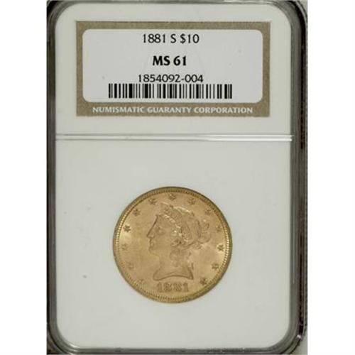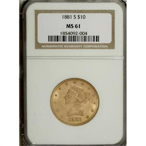 <B>1881-S $10 MS61 NGC.</B></I> NGC Census: (800/330). PCGS Population (316/256). Mintage: 970,000. Numismedia Wsl. Price: $380. (#8694)<BR><BR><B>Coin Engraver:</B> Christian Gobrecht<BR><BR><b>Shipping:</b> Coins & Currency (<a target="_blank" href="http://www.heritageauctions.com/common/shipping.php">view shipping information</a>\)