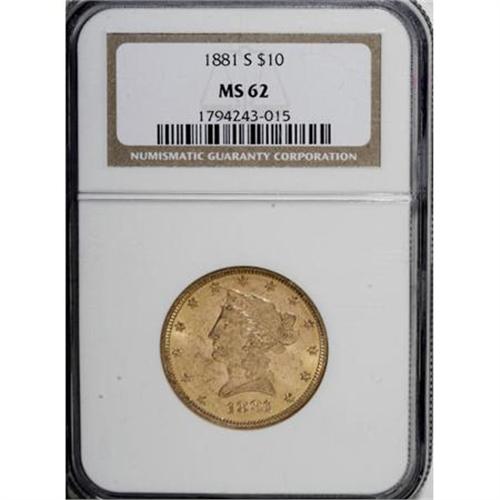 <B>1881-S $10 MS62 NGC.</B></I> NGC Census: (323/15). PCGS Population (259/21). Mintage: 970,000. Numismedia Wsl. Price for NGC/PCGS coin in MS62: $440. (#8694)<BR><BR><B>Coin Engraver:</B> Christian Gobrecht<BR><BR><b>Shipping:</b> Coins & Currency (<a target="_blank" href="http://www.heritageauctions.com/common/shipping.php">view shipping information</a>\)
