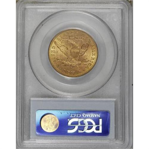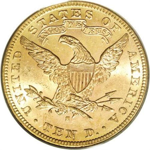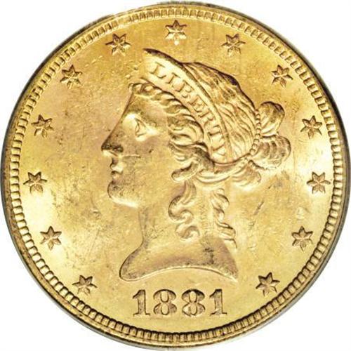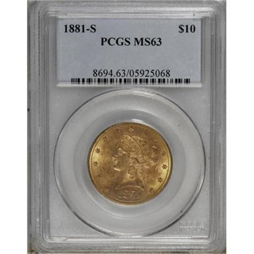<B>1881-S $10 MS63 PCGS.</B></I> Originally toned with lime borders and peach fields and devices. Sharply struck and moderately abraded. More than a thousand 1881-S tens have been certified as Mint State, but the vast majority of these are MS60 to MS62. None have been certified by either major service in grades above MS63. Population: 22 in 63, 0 finer (2/08).<BR><BR><B>Coin Engraver:</B> Christian Gobrecht<BR><BR><b>Shipping:</b> Coins & Currency (<a target="_blank" href="http://www.heritageauctions.com/common/shipping.php">view shipping information</a>)