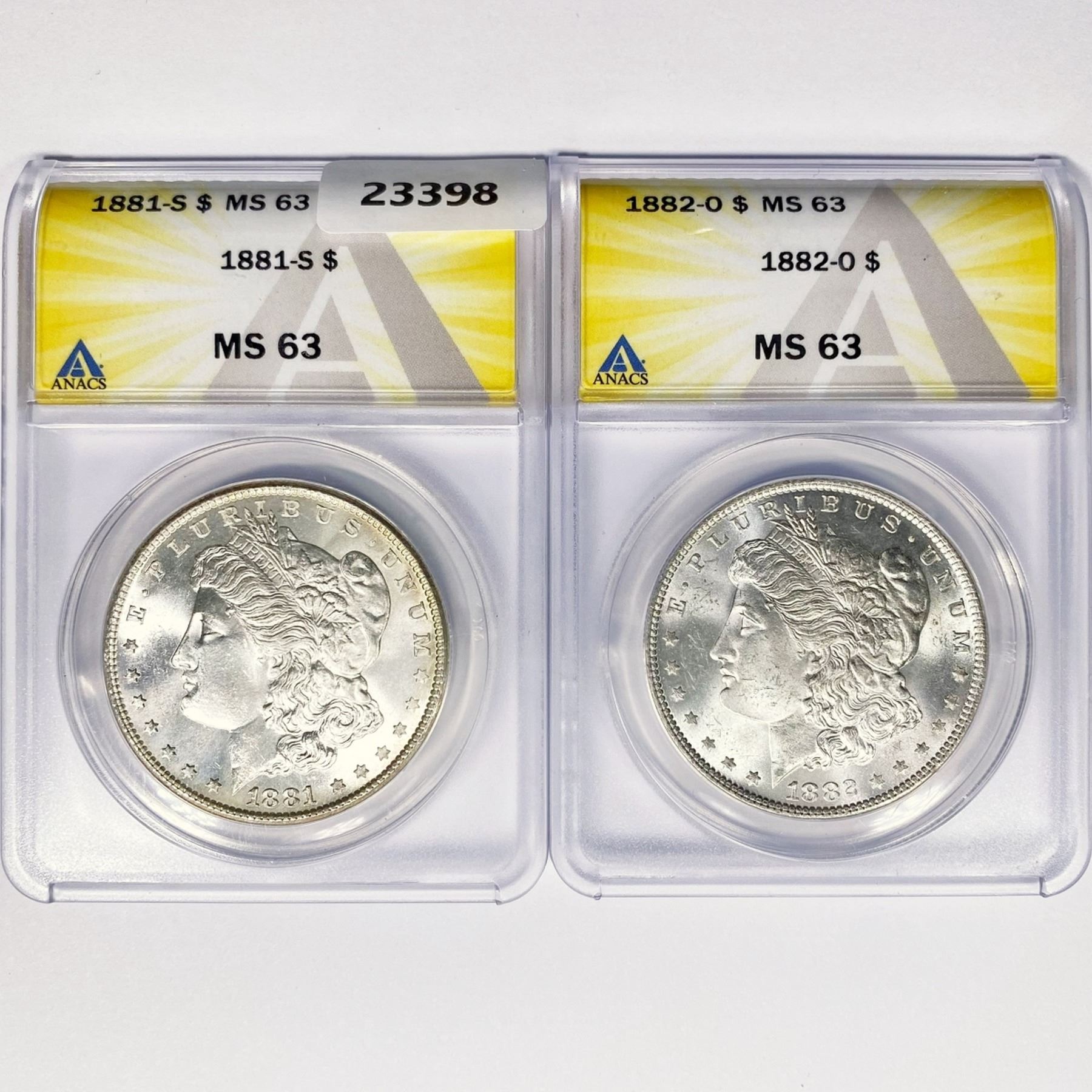 1881-S, 1882-O Set (2) Morgan Dollars ANACS MS63