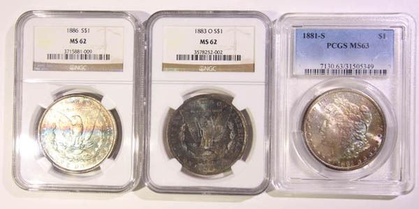 1881-S/1886-S Morgan Dollars, group of three colorful graded. 1881-S PCGS MS63; 1883-O NGC MS62; 1886-S NGC MS62.