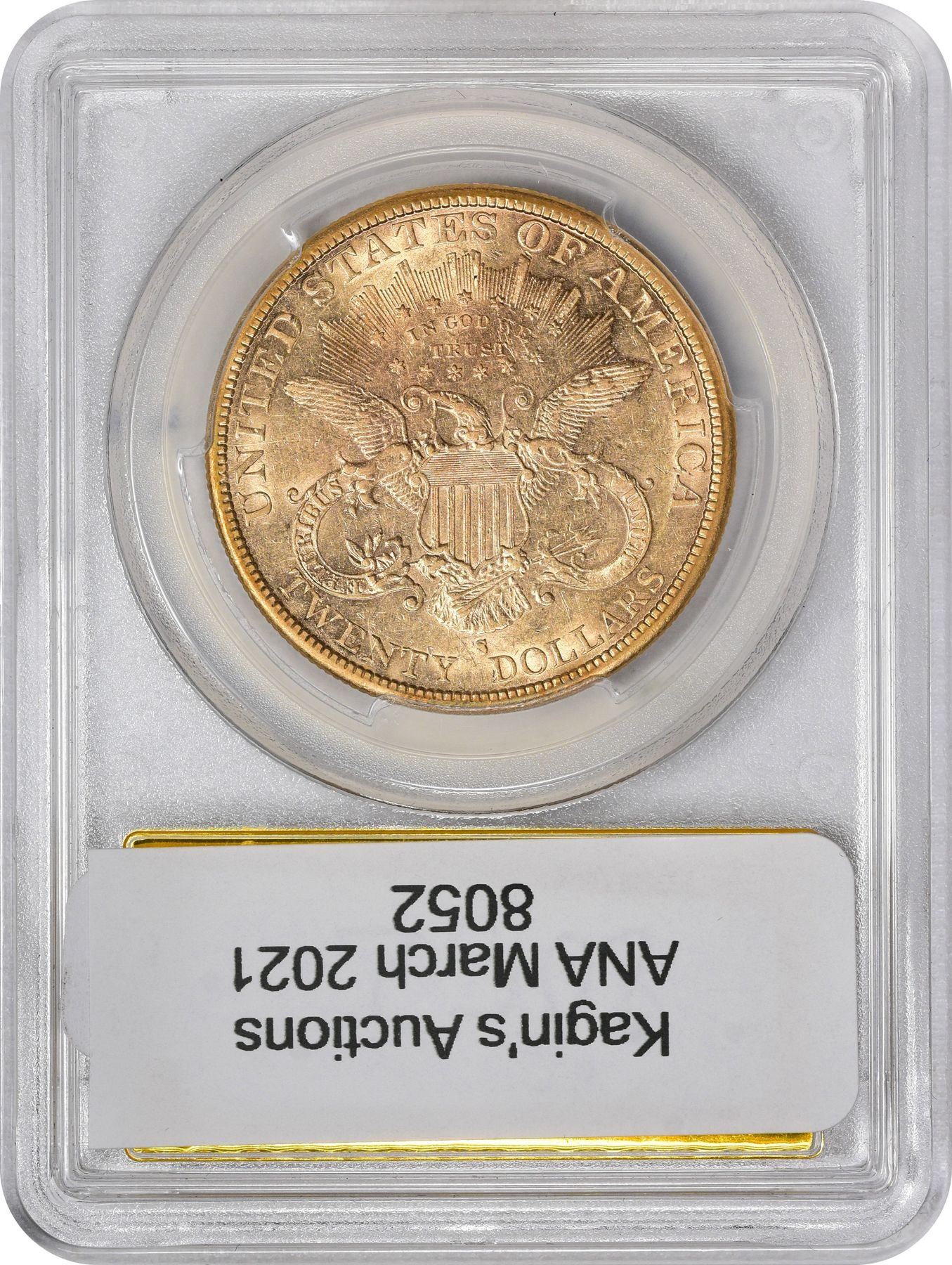 Description: Bold cartwheel luster whirls its way across the bright yellow surfaces; we note a toning spot at the top of Liberty’s bun. A special PCGS gold foil label designates the Saddle Ridge origin of this coin. The Saddle Ridge Hoard was discovered a few years ago on private property in California when the owner’s dog dug up some rusty old cans on Saddle Ridge; the rusty old cans contained scores of 19th-century gold coins in varying grades, including “finest known” specimens, etc. The initial offering of the Saddle Ridge Hoard was by our firm, Kagin’s, Inc., and the coins sold quickly. Included among the pieces were seven examples of the presently offered date in Mint State grades up to MS-64! It is a pleasure now to welcome one of our old friends back to the auction arena.