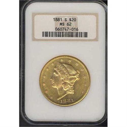 <b>1881-S $20 Liberty. NGC graded MS62.</b> This is a remarkably lustrous coin whose pinkish-gold features are alive with choice mint frost. The fully detailed surfaces are lapping at the shores of an even higher grade <b>(PCGS # 8995)</b> <i>