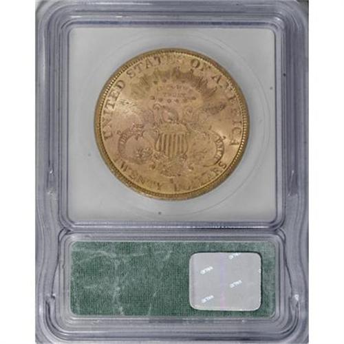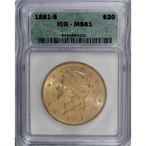 <B>1881-S $20 MS61 ICG.</B></I> Apricot-gold surfaces are laced with whispers of red and mint-green, especially on the reverse, and an attentive strike brings out fairly sharp definition on the design elements. The luster flow, particularly on the obverse, is slightly interrupted by small contact marks.<BR><BR><b>Shipping:</b> Coins & Currency (<a target="_blank" href="http://www.heritageauctions.com/common/shipping.php">view shipping information</a>)