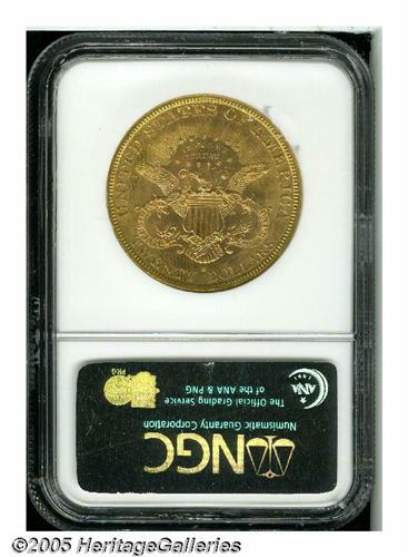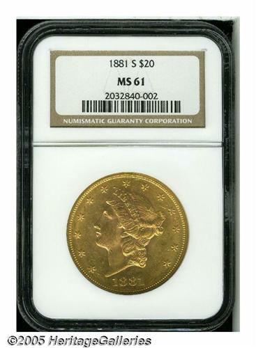 <B>1881-S<$20> MS61 NGC.</B></I> Fully struck with pretty red-gold toning and a dazzlingly bright, flashy, semi-prooflike appearance on both sides. A mildly scuffy overall appearance defines the numerical grade of the piece. A very underrated date that is surprisingly scarce in this and higher grades. NGC (5/05) reports only 41 finer, the two best at only the MS63 level. PCGS (5/05) reports their best as one piece at the MS 64 level.<BR><I>From the Dr. Kurt Peters Collection.</B></I> From the Dr. Kurt Peters Collection.