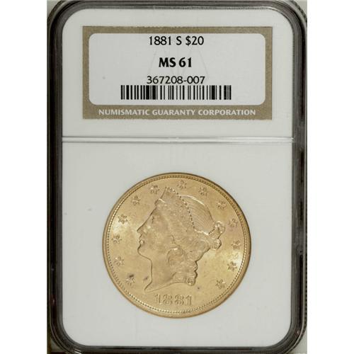 <B>1881-S $20 MS61 NGC.</B></I> Orange-gold color glows through nicely lustrous fields, and sharp definition is apparent on the motifs. Lightly abraded on both the obverse and reverse, but no marks of major consequence. This date is scarce in Mint State grades<BR><BR><b>Shipping:</b> Coin/Currency (<a target="_blank" href="http://www.heritageauctions.com/common/shipping.php">view shipping information</a>)
