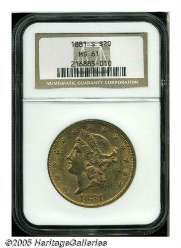 <B>1881-S<$20> MS61 NGC.</B></I> This intricately struck apricot-gold example has luminous luster and the expected number of individually unimportant bagmarks. The mintage of 727,000 pieces is relatively low for a San Francisco Mint Twenty from this era, and Mint State survivors are somewhat scarce.