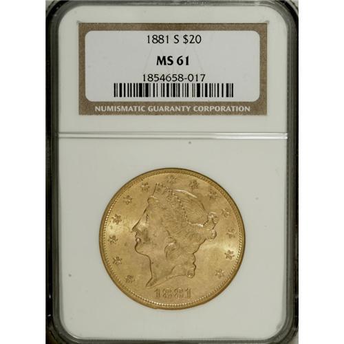 <B>1881-S $20 MS61 NGC.</B></I> Vivacious luster brightens this sharply struck and conditionally rare double eagle. As is customary for the grade, numerous minor abrasions are present, but these are less consequential than usually seen.<BR><BR><b>Shipping:</b> Coins & Currency (<a target="_blank" href="http://www.heritageauctions.com/common/shipping.php">view shipping information</a>)