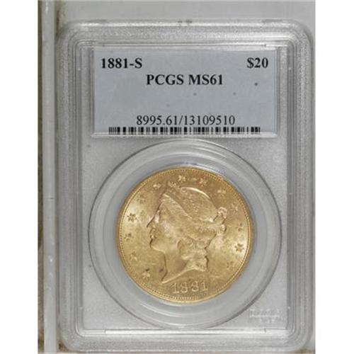 <B>1881-S $20 MS61 PCGS.</B></I> PCGS Population (105/92). NGC Census: (165/54). Mintage: 727,000. Numismedia Wsl. Price for NGC/PCGS coin in MS61: $1,400. (#8995)<BR><BR><b>Shipping:</b> Coins & Currency (<a target="_blank" href="http://www.heritageauctions.com/common/shipping.php">view shipping information</a>)