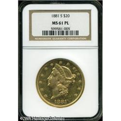 <B>1881-S $20 MS61 Prooflike NGC.</B></I> A sharply struck and suitably reflective piece, typically marked for the grade. One of just two pieces certified by NGC as Prooflike, both at the MS61 level, and both, by coincidence, are in the present auction. Lot:9166