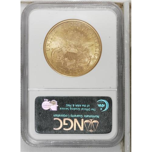 <B>1881-S $20 MS62 NGC.</B></I> Strongly lustrous with attractive apricot-gold surfaces that are unusually appealing for the grade. Excellent detail overall with just a touch of softness on the eagle's neck. Despite the strong mintage of 727,000 pieces, few examples escaped the rigors of circulation. NGC has graded only two Select or better representatives (4/07).<BR><BR><b>Shipping:</b> Coins & Currency (<a target="_blank" href="http://www.heritageauctions.com/common/shipping.php">view shipping information</a>)