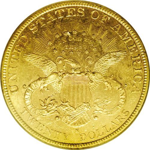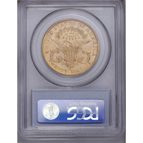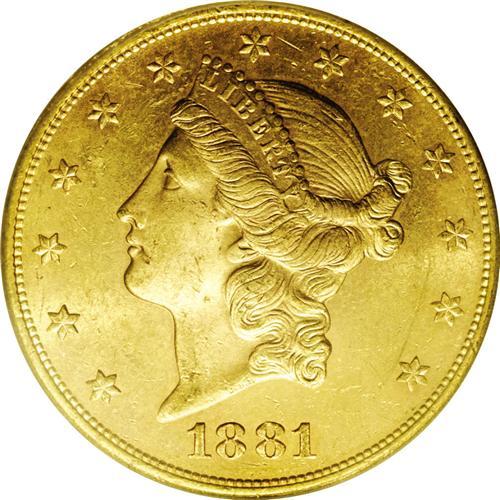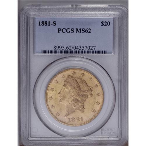 <B>1881-S $20 MS62 PCGS.</B></I> This boldly struck apricot-gold double eagle has just a hint of prooflike flash in the fields, although satin luster is also present. As is customary for the MS62 grade, small marks are seen here and there, but the cheek is relatively clean, and there is no singularly distracting contact. Scarce in Mint State than most later S-mint issues. Population: 89 in 62, 16 finer (1/06).