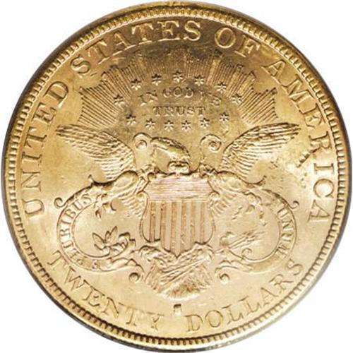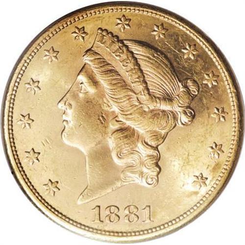 <B>1881-S $20 MS62 PCGS.</B></I> At the time of its release, apparently no examples of the 1881-S were set aside by numismatists. Mint State examples exist, but were indifferently stored as bullion or bank reserves. The issue is nearly unobtainable in MS63 or finer grades, and many astute collectors instead seek a high-end MS62 example. This lustrous and evenly struck example has a few scattered bagmarks, but is pleasing for the grade overall.<BR><BR><B>Coin Engraver:</B> James B. Longacre<BR><BR><b>Shipping:</b> Coins & Currency (<a target="_blank" href="http://www.heritageauctions.com/common/shipping.php">view shipping information</a>)