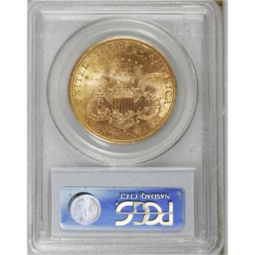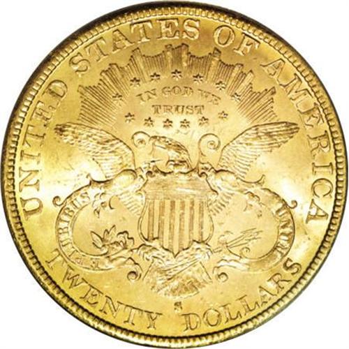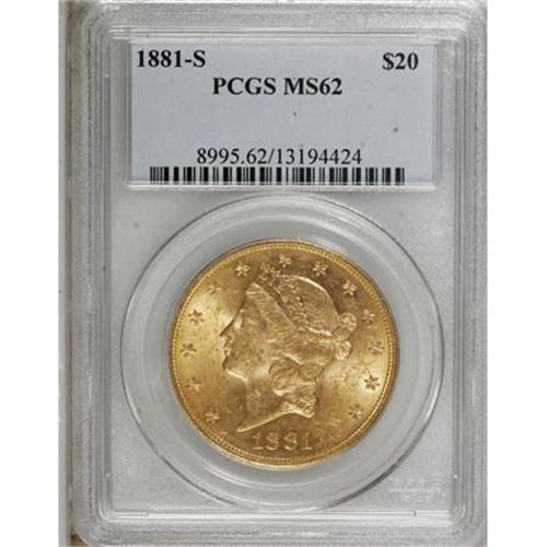 <B>1881-S $20 MS62 PCGS.</B></I> Were it not for a few light abrasions on each side, this piece would likely merit a Select ranking. The fields are lustrous apricot-gold, with a bold strike and generous eye appeal. Seldom seen finer, as PCGS has certified only 18 pieces in a higher grade (12/07).<BR><BR><B>Coin Engraver:</B> James B. Longacre<BR><BR><b>Shipping:</b> Coins & Currency (<a target="_blank" href="http://www.heritageauctions.com/common/shipping.php">view shipping information</a>)