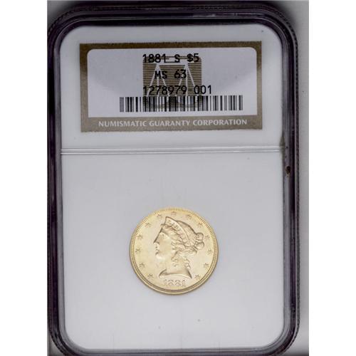 1881-S $5 MS63 NGC. This bright straw-gold example is 1881-S[$5] MS63 NGC.