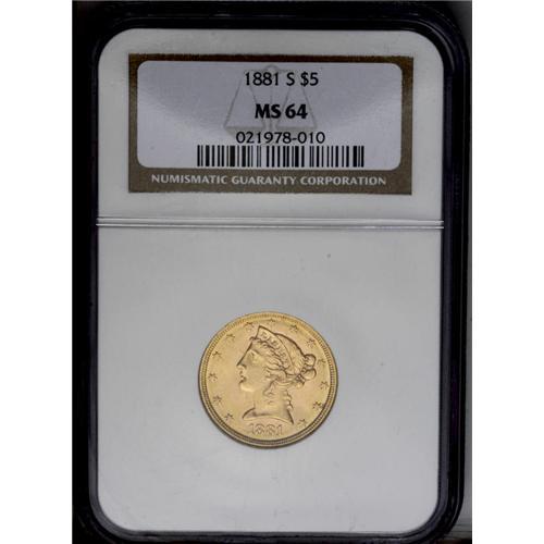 <B>1881-S<$5> MS64 NGC.</B></I> Booming cartwheel luster sweeps this smooth and lovely Choice half eagle. Crisply struck, and difficult to acquire any finer. Census: 86 in 64, 15 finer (6/06).
