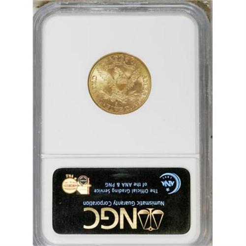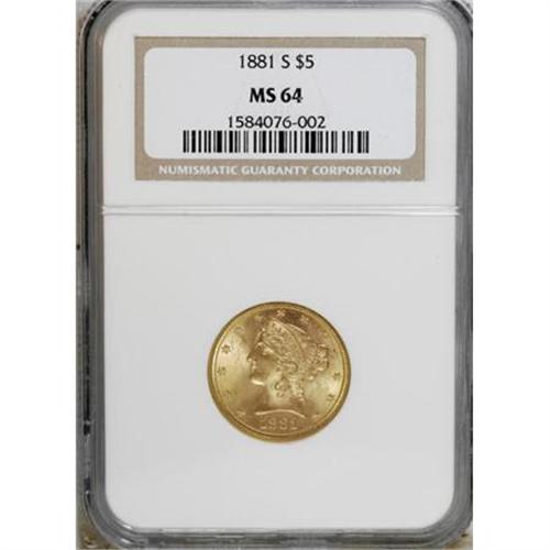 <B>1881-S $5 MS64 NGC.</B></I> A delightful near-Gem and a condition rarity among Liberty half eagles. NGC has graded just 16 finer examples. This piece is nicely struck with brilliant yellow-gold surfaces.<BR><BR><B>Coin Engraver:</B> Christian Gobrecht<BR><BR><b>Shipping:</b> Coins & Currency (<a target="_blank" href="http://www.heritageauctions.com/common/shipping.php">view shipping information</a>)