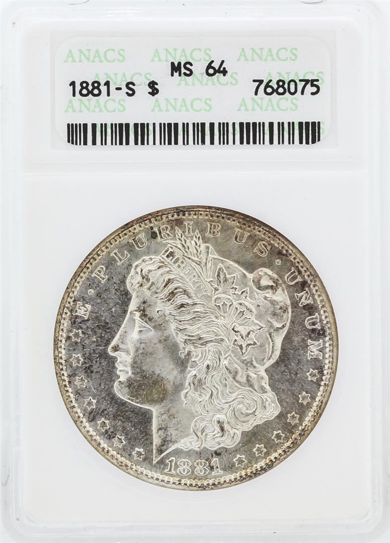 One 1881-S ANACS MS64 Morgan Silver Dollar. ANACS Appraised.