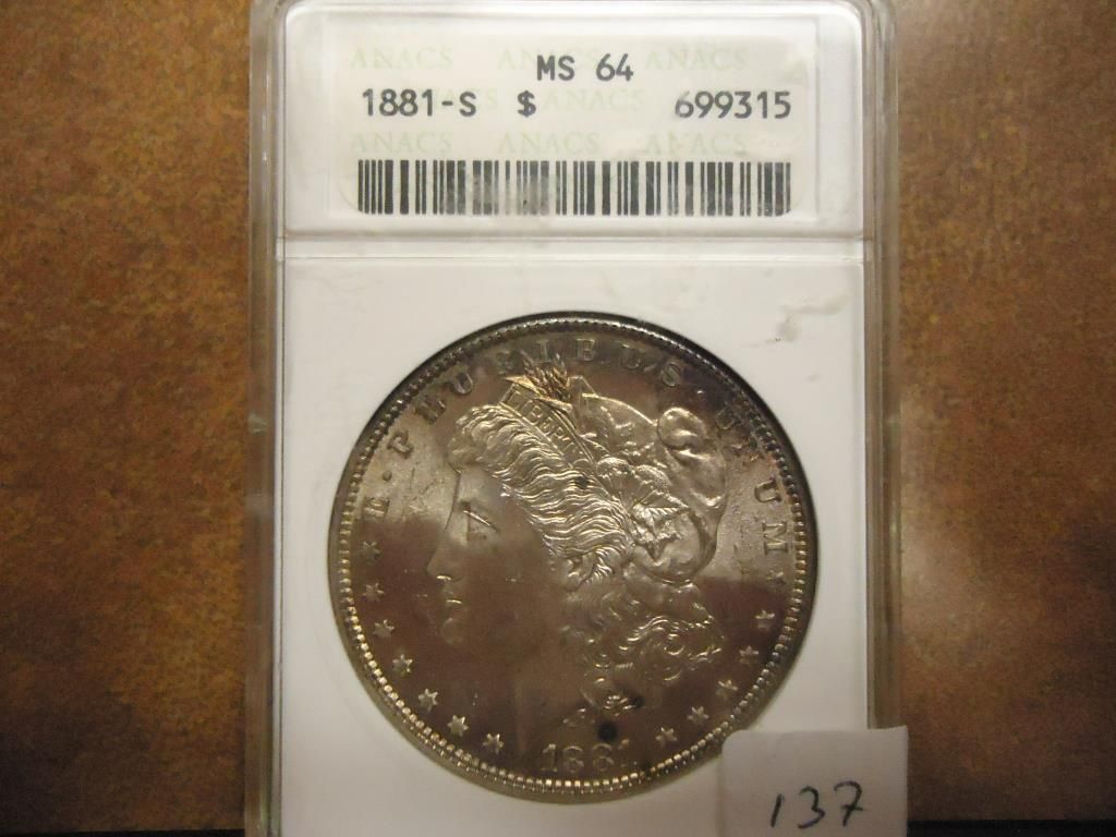 1881-S MORGAN SILVER DOLLAR ANACS MS64 TONED