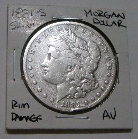 1881-S MORGAN SILVER DOLLAR *RARE AU HIGH GRADE* RIM DAMAGE!! ***Coin, Currency & All Items Listed in this auction - Grades, Conditions and Values are not Safe Deposit Coins LLC Responsibilty. Grades, Condition and Values are determined by Consigner(s) & Buyers ONLY