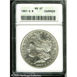 <B>1881-S<img border='0' src='http://www.heritagecoins.com/images/star.gif' width=10 height=10>$1 MS67 ANACS.</B></I> Fully struck and nearly pristine, with amazingly bright, brilliant surfaces. A truly beautiful Superb Gem. Lot:10060