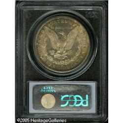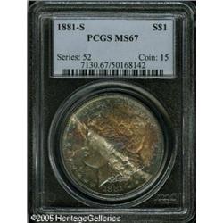 <B>1881-S<img border='0' src='http://www.heritagecoins.com/images/star.gif' width=10 height=10>$1 MS67 PCGS.</B></I> Interestingly patinated with royal-blue color dominating the otherwise amber and violet obverse and amber color dominating the reverse. The surfaces show an impeccable state of preservation and the devices are bold as is typical for the date. Lot:10059