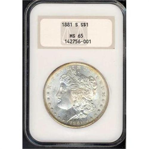 <b>1881-S Morgan Dollar. NGC graded MS65.</b> Sparkling mint brilliance and booming mint luster characterize the surfaces of this '81-S and give the viewer an immediate and lasting impression of unparalleled quality <b>(PCGS # 7130)</b>