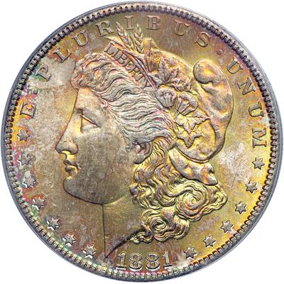 1881-S Morgan Dollar. PCGS graded MS-65. Wonderful obverse toning and a Gem (PCGS # 7130).