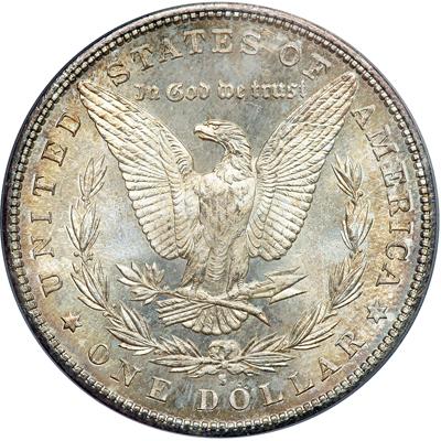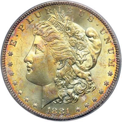 1881-S Morgan Dollar. PCGS graded MS-66. The obverse displays lovely gold and lime green colors. A dazzler whose luster delights the eye with its cartwheel spin (PCGS # 7130).