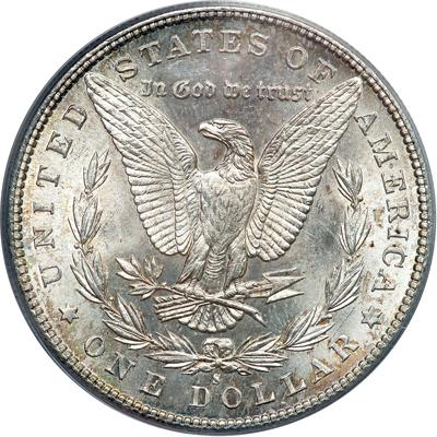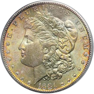 1881-S Morgan Dollar. PCGS graded MS-66. The obverse has gold, blue, and lime green toning. Another offering the bidder full cartwheel spin luster (PCGS # 7130).