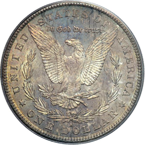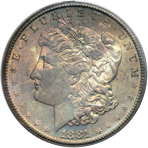 1881-S Morgan Dollar. PCGS graded MS-64. Lovely, slightly iridescent, multi-color toning on both sides (PCGS # 7130) .