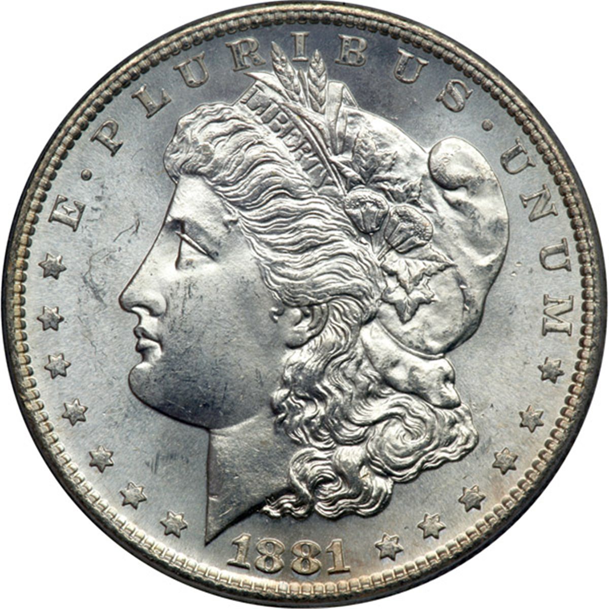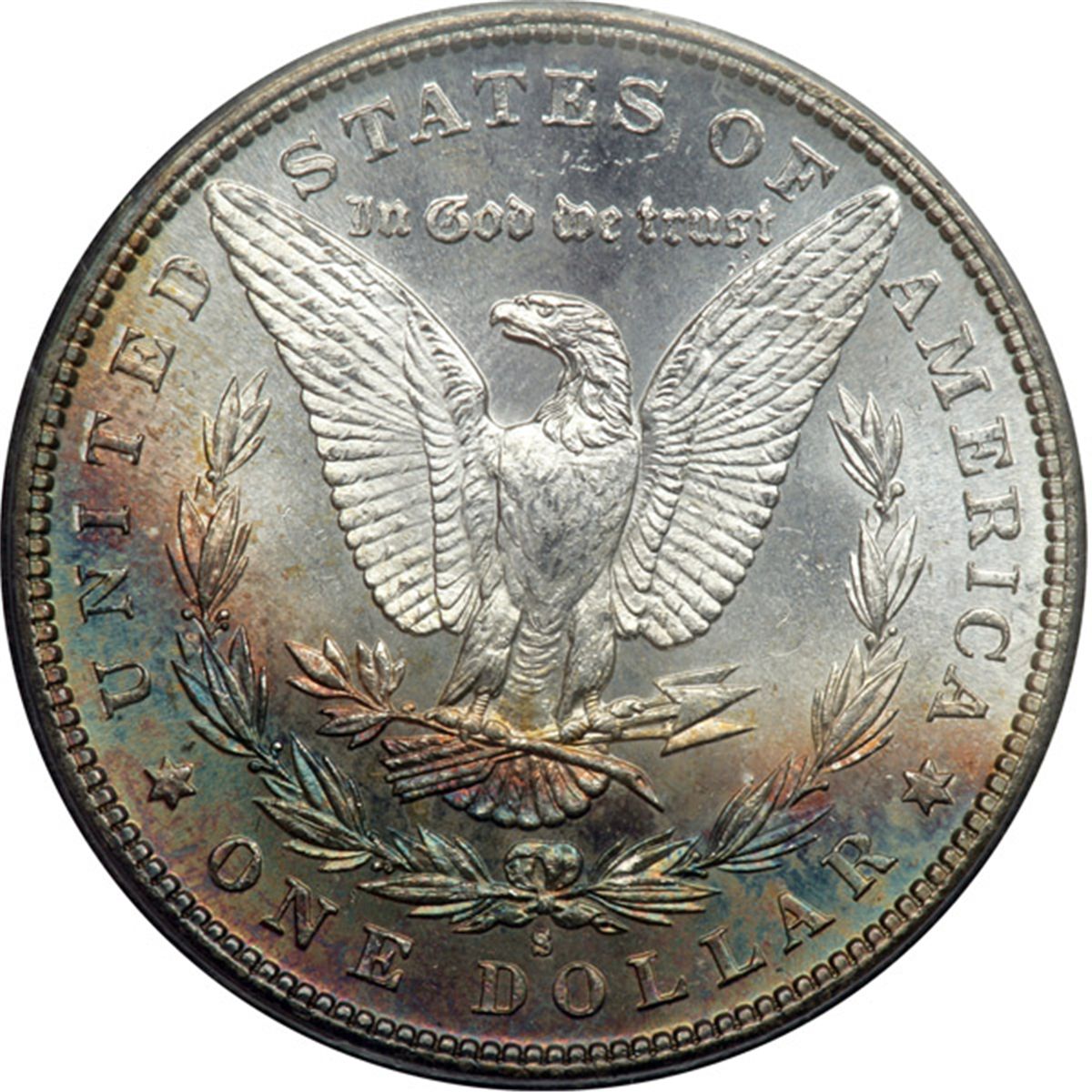 1881-S Morgan Dollar. PCGS graded MS-64+. Nice reverse partial rainbow toning. The obverse is white (PCGS # 7130) .