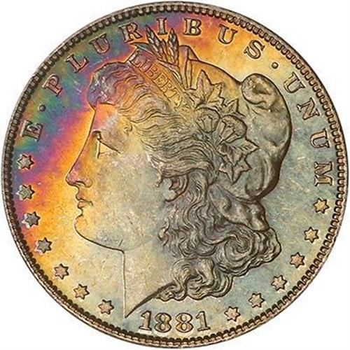 Sharply struck throughout, the surfaces show even silvery bloom on one side (the reverse) and there are no mentionable abrasions on either side. The obverse, of course, is where the action is on this gorgeous '81-S. Colors swirl around and make a harmonious rainbow display.