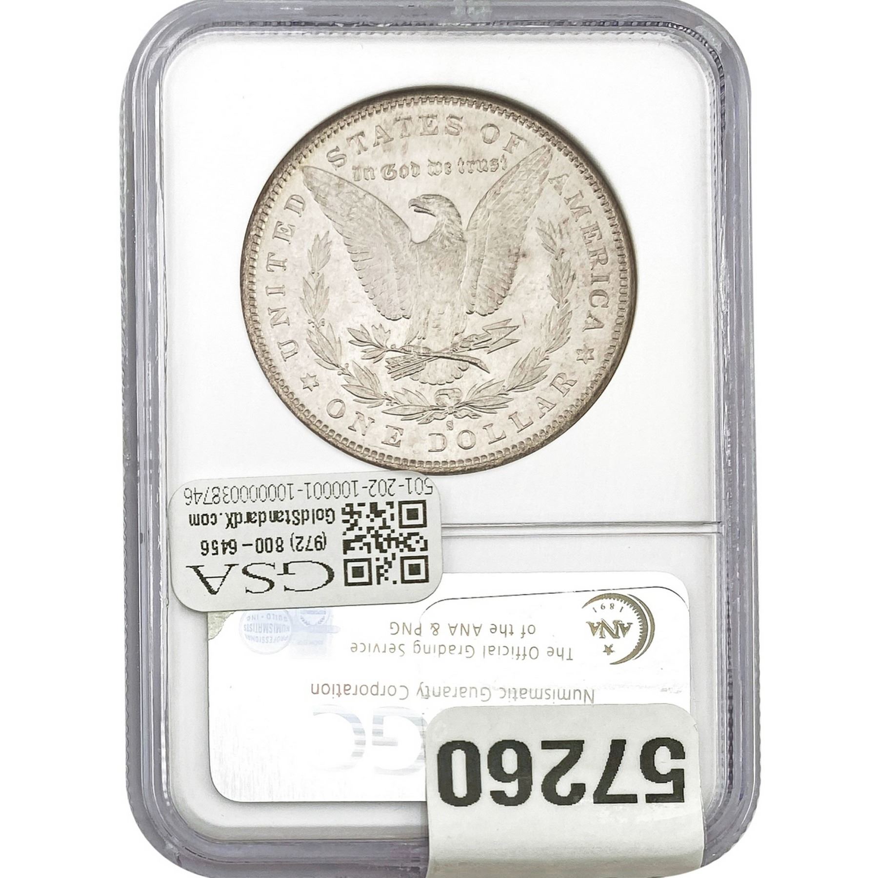 e. Coins sold referencing a third-party grading service are sold “AS IS” without any express or implied warranty, except for a guarantee by GSA that they are genuine. Removal or alteration of the holder, voids all of Bidder’s claims concerning that Product. Certain warranties may be available from the grading services and Bidders are referred to them for further details: Numismatic Guaranty Corporation (NGC), PO Box 4776, Sarasota, FL 34230, www.ngccoin.com/services/writtenguarantee.asp; Professional Coin Grading Services (PCGS), PO Box 9458, Newport Beach, CA 92658, www.pcgs.com/guarantee.html; ANACS, 6555 S. Kenton St., Ste. 303, Englewood, CO 80111; and Independent Coin Grading Co. (ICG), 7901 East Bellview, Ave., Suite 50, Englewood, CO 80111.