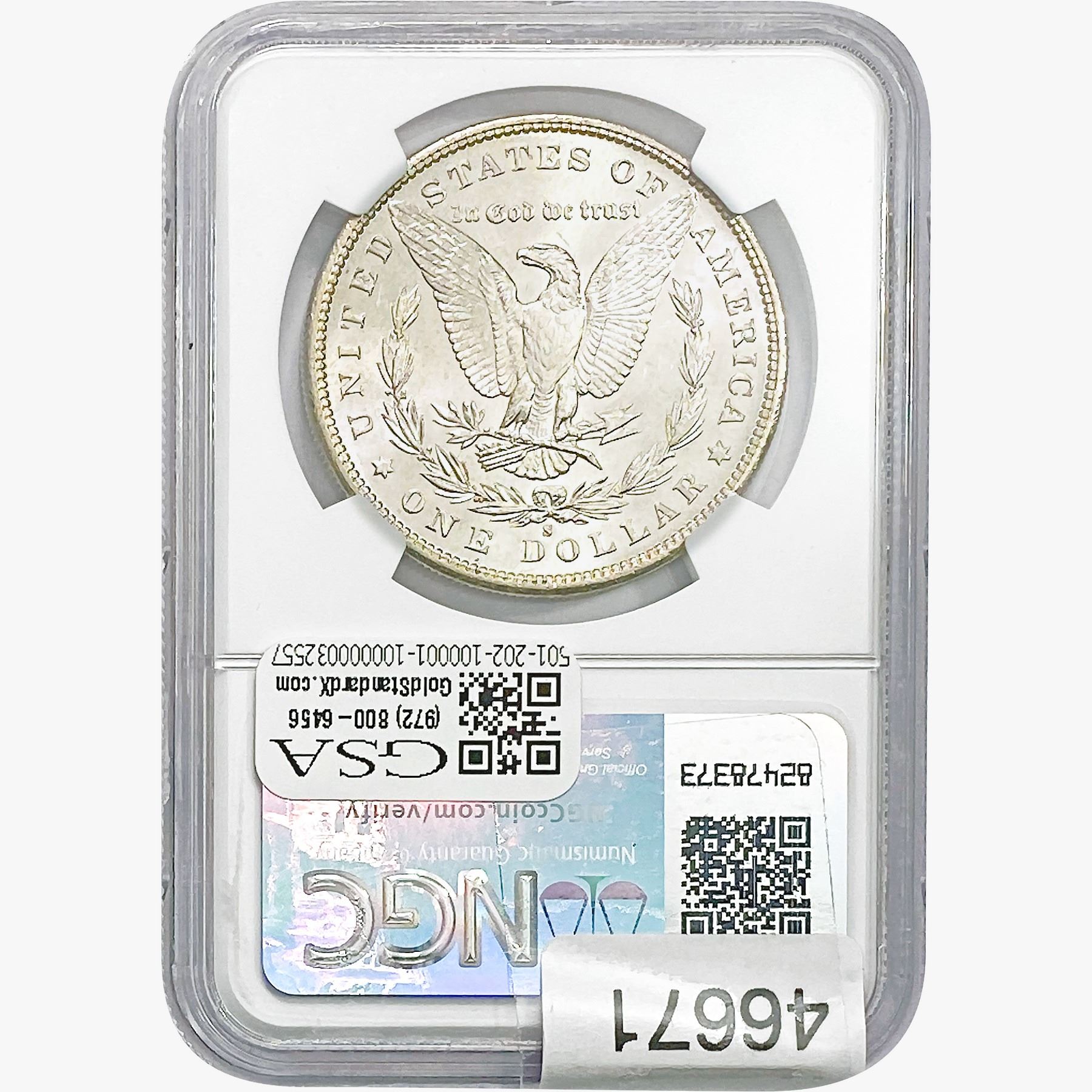 e. Coins sold referencing a third-party grading service are sold “AS IS” without any express or implied warranty, except for a guarantee by GSA that they are genuine. Removal or alteration of the holder, voids all of Bidder’s claims concerning that Product. Certain warranties may be available from the grading services and Bidders are referred to them for further details: Numismatic Guaranty Corporation (NGC), PO Box 4776, Sarasota, FL 34230, www.ngccoin.com/services/writtenguarantee.asp; Professional Coin Grading Services (PCGS), PO Box 9458, Newport Beach, CA 92658, www.pcgs.com/guarantee.html; ANACS, 6555 S. Kenton St., Ste. 303, Englewood, CO 80111; and Independent Coin Grading Co. (ICG), 7901 East Bellview, Ave., Suite 50, Englewood, CO 80111.