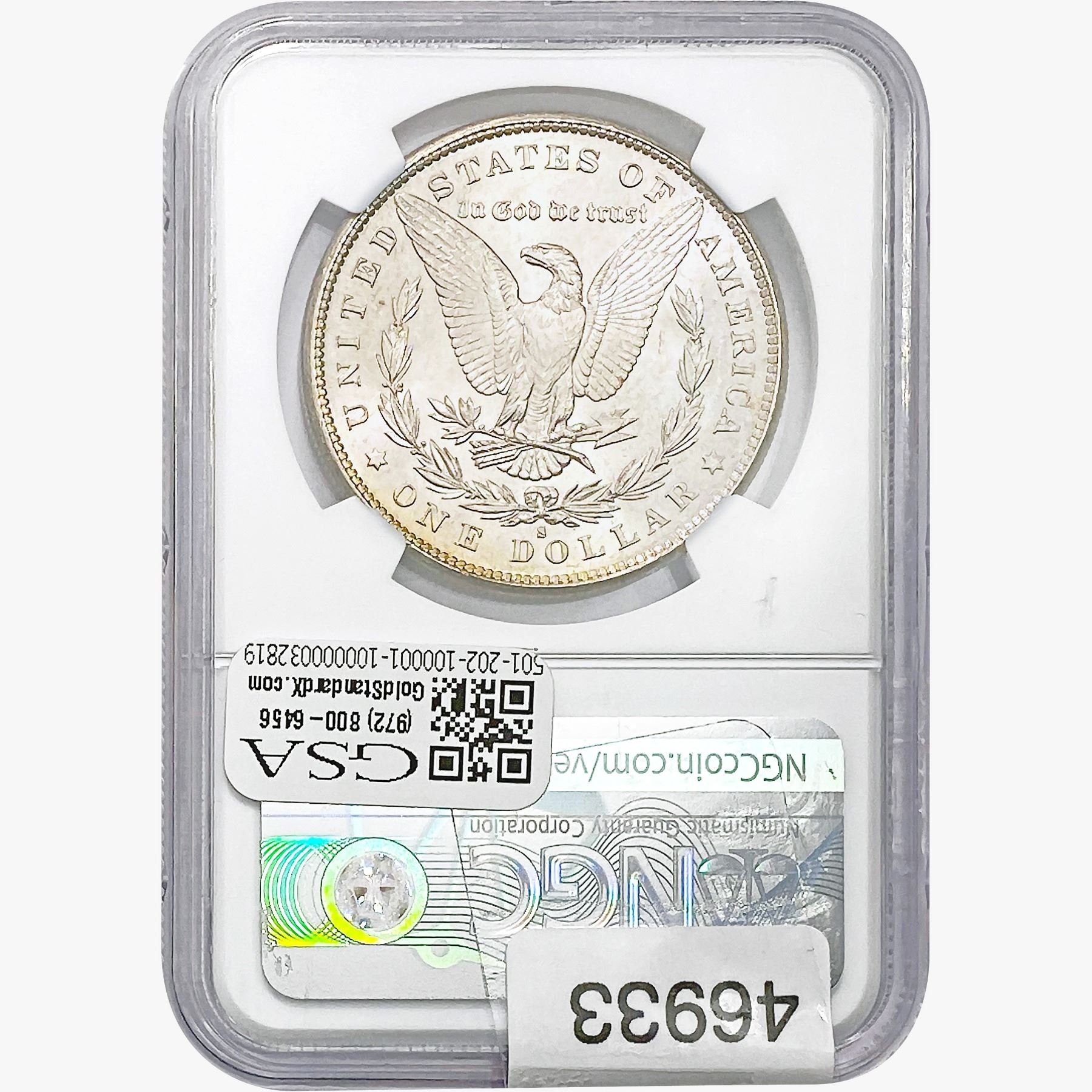 e. Coins sold referencing a third-party grading service are sold “AS IS” without any express or implied warranty, except for a guarantee by GSA that they are genuine. Removal or alteration of the holder, voids all of Bidder’s claims concerning that Product. Certain warranties may be available from the grading services and Bidders are referred to them for further details: Numismatic Guaranty Corporation (NGC), PO Box 4776, Sarasota, FL 34230, www.ngccoin.com/services/writtenguarantee.asp; Professional Coin Grading Services (PCGS), PO Box 9458, Newport Beach, CA 92658, www.pcgs.com/guarantee.html; ANACS, 6555 S. Kenton St., Ste. 303, Englewood, CO 80111; and Independent Coin Grading Co. (ICG), 7901 East Bellview, Ave., Suite 50, Englewood, CO 80111.