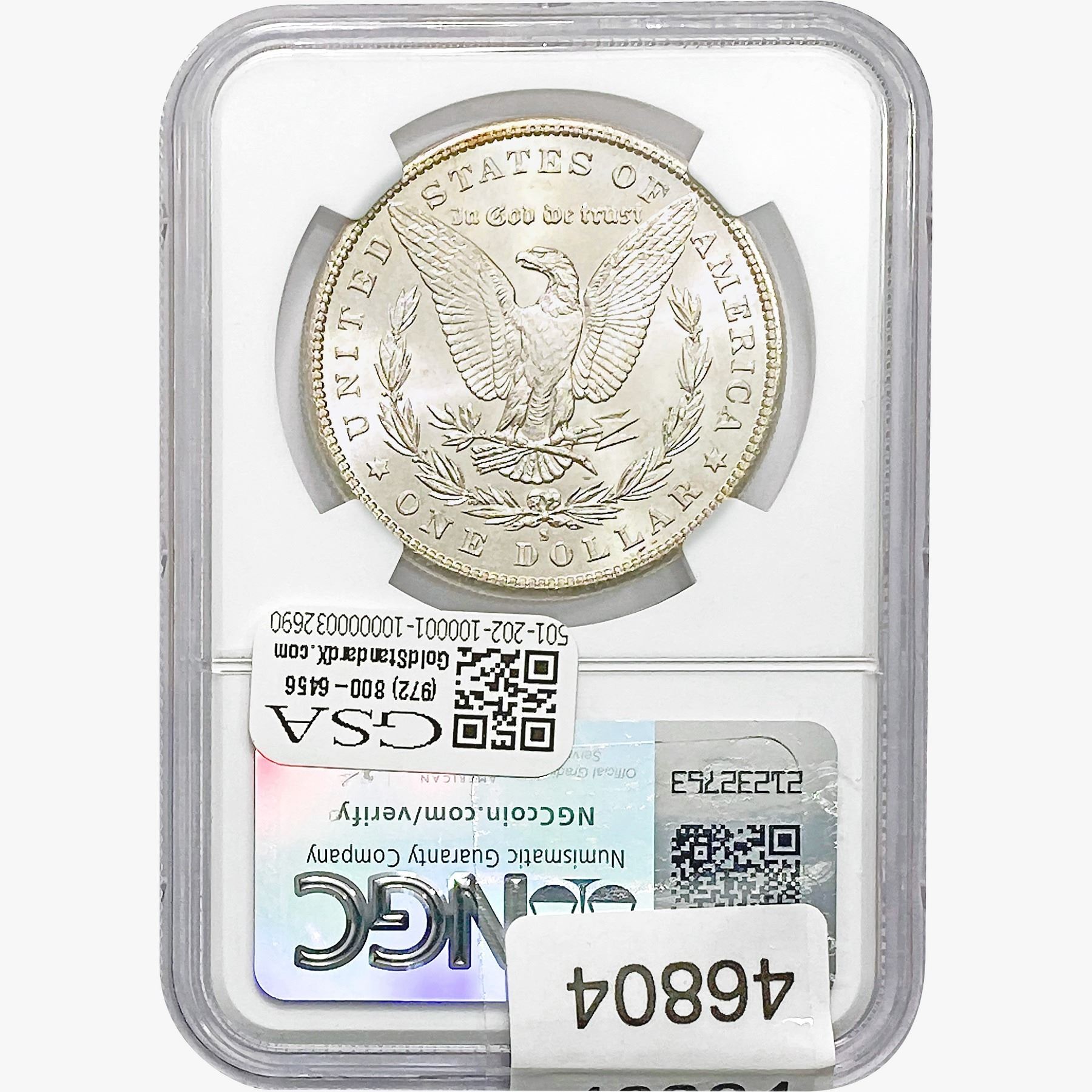 e. Coins sold referencing a third-party grading service are sold “AS IS” without any express or implied warranty, except for a guarantee by GSA that they are genuine. Removal or alteration of the holder, voids all of Bidder’s claims concerning that Product. Certain warranties may be available from the grading services and Bidders are referred to them for further details: Numismatic Guaranty Corporation (NGC), PO Box 4776, Sarasota, FL 34230, www.ngccoin.com/services/writtenguarantee.asp; Professional Coin Grading Services (PCGS), PO Box 9458, Newport Beach, CA 92658, www.pcgs.com/guarantee.html; ANACS, 6555 S. Kenton St., Ste. 303, Englewood, CO 80111; and Independent Coin Grading Co. (ICG), 7901 East Bellview, Ave., Suite 50, Englewood, CO 80111.