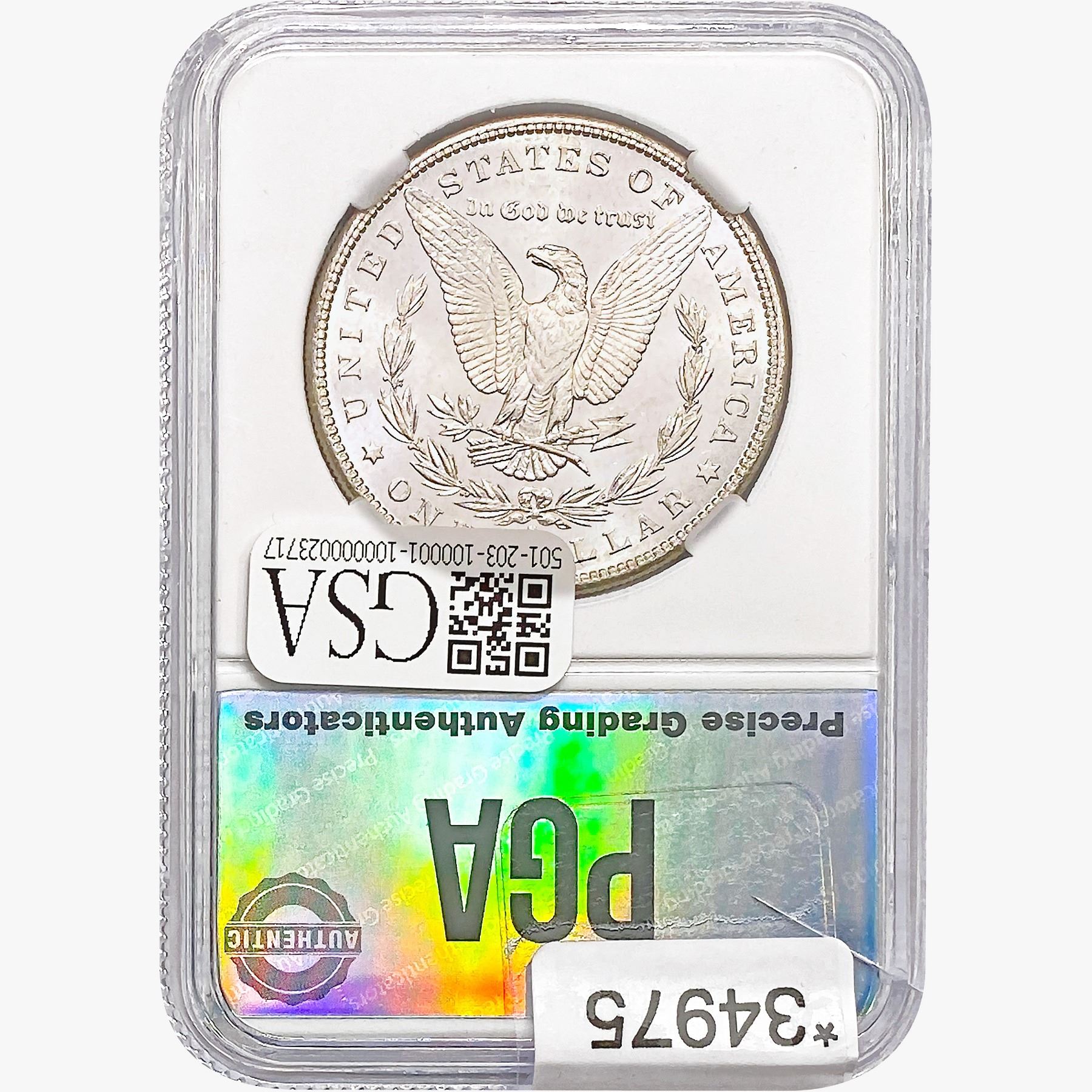 COINS AND CURRENCY LISTED IN GSA’S CATALOG AS GRADED AND ENCAPSULATED BY PCGS, NGC, ANACS, ICG, PCGS CURRENCY, PMG, PCGS BANKNOTE GRADING, CMC OR ANY OTHER THIRD-PARTY GRADING SERVICE ARE LIKEWISE SOLD “AS-IS” EXCEPT AS EXPRESSLY SET FORTH HEREIN. ALL THIRD-PARTY GRADING SERVICE GUARANTEES, INCLUDING AUTHENTICITY, ARE THE SOLE RESPONSIBILITY OF THE THIRD-PARTY GRADING SERVICE AND NOT WARRANTIES OR GUARANTEES OF GSA. BIDDERS SHOULD CONTACT THESE THIRD-PARTY GRADING SERVICES DIRECTLY WITH RESPECT TO ANY CLAIMS OR QUESTIONS THEY MAY HAVE CONCERNING THEIR GUARANTEES AND WARRANTIES. BIDDERS ACKNOWLEDGE AND AGREE THAT AUCTIONEER IS NOT BOUND BY OR LIABLE FOR ANY OPINION OR CERTIFICATION BY ANY THIRD-PARTY GRADING SERVICE. REMOVAL OF A PRODUCT FROM ITS PROTECTIVE CASING OR HOLDER OR ALTERATION OF ANY COIN HOLDER WAIVES ALL RIGHTS CONCERNING THE PRODUCT CONTAINED THEREIN.