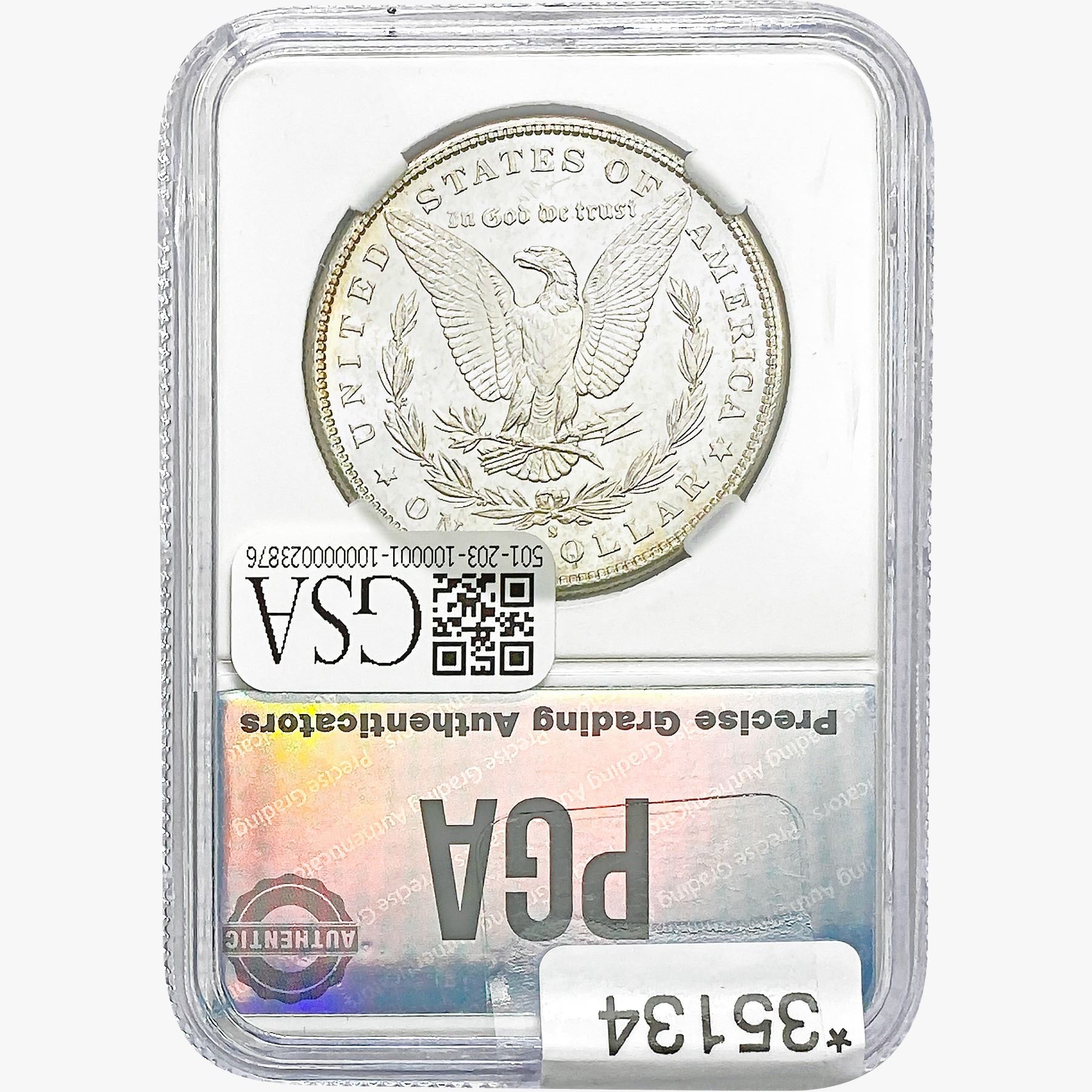 COINS AND CURRENCY LISTED IN GSA’S CATALOG AS GRADED AND ENCAPSULATED BY PCGS, NGC, ANACS, ICG, PCGS CURRENCY, PMG, PCGS BANKNOTE GRADING, CMC OR ANY OTHER THIRD-PARTY GRADING SERVICE ARE LIKEWISE SOLD “AS-IS” EXCEPT AS EXPRESSLY SET FORTH HEREIN. ALL THIRD-PARTY GRADING SERVICE GUARANTEES, INCLUDING AUTHENTICITY, ARE THE SOLE RESPONSIBILITY OF THE THIRD-PARTY GRADING SERVICE AND NOT WARRANTIES OR GUARANTEES OF GSA. BIDDERS SHOULD CONTACT THESE THIRD-PARTY GRADING SERVICES DIRECTLY WITH RESPECT TO ANY CLAIMS OR QUESTIONS THEY MAY HAVE CONCERNING THEIR GUARANTEES AND WARRANTIES. BIDDERS ACKNOWLEDGE AND AGREE THAT AUCTIONEER IS NOT BOUND BY OR LIABLE FOR ANY OPINION OR CERTIFICATION BY ANY THIRD-PARTY GRADING SERVICE. REMOVAL OF A PRODUCT FROM ITS PROTECTIVE CASING OR HOLDER OR ALTERATION OF ANY COIN HOLDER WAIVES ALL RIGHTS CONCERNING THE PRODUCT CONTAINED THEREIN.