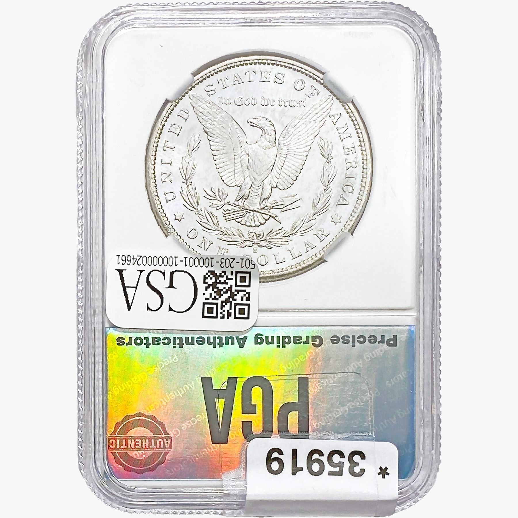 COINS AND CURRENCY LISTED IN GSA’S CATALOG AS GRADED AND ENCAPSULATED BY PCGS, NGC, ANACS, ICG, PCGS CURRENCY, PMG, PCGS BANKNOTE GRADING, CMC OR ANY OTHER THIRD-PARTY GRADING SERVICE ARE LIKEWISE SOLD “AS-IS” EXCEPT AS EXPRESSLY SET FORTH HEREIN. ALL THIRD-PARTY GRADING SERVICE GUARANTEES, INCLUDING AUTHENTICITY, ARE THE SOLE RESPONSIBILITY OF THE THIRD-PARTY GRADING SERVICE AND NOT WARRANTIES OR GUARANTEES OF GSA. BIDDERS SHOULD CONTACT THESE THIRD-PARTY GRADING SERVICES DIRECTLY WITH RESPECT TO ANY CLAIMS OR QUESTIONS THEY MAY HAVE CONCERNING THEIR GUARANTEES AND WARRANTIES. BIDDERS ACKNOWLEDGE AND AGREE THAT AUCTIONEER IS NOT BOUND BY OR LIABLE FOR ANY OPINION OR CERTIFICATION BY ANY THIRD-PARTY GRADING SERVICE. REMOVAL OF A PRODUCT FROM ITS PROTECTIVE CASING OR HOLDER OR ALTERATION OF ANY COIN HOLDER WAIVES ALL RIGHTS CONCERNING THE PRODUCT CONTAINED THEREIN.