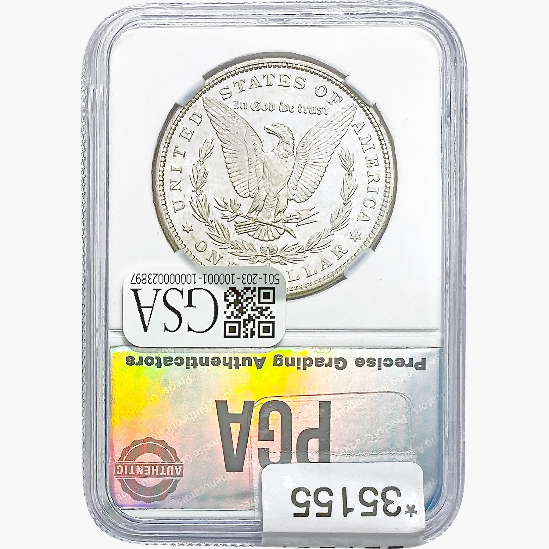 COINS AND CURRENCY LISTED IN GSA’S CATALOG AS GRADED AND ENCAPSULATED BY PCGS, NGC, ANACS, ICG, PCGS CURRENCY, PMG, PCGS BANKNOTE GRADING, CMC OR ANY OTHER THIRD-PARTY GRADING SERVICE ARE LIKEWISE SOLD “AS-IS” EXCEPT AS EXPRESSLY SET FORTH HEREIN. ALL THIRD-PARTY GRADING SERVICE GUARANTEES, INCLUDING AUTHENTICITY, ARE THE SOLE RESPONSIBILITY OF THE THIRD-PARTY GRADING SERVICE AND NOT WARRANTIES OR GUARANTEES OF GSA. BIDDERS SHOULD CONTACT THESE THIRD-PARTY GRADING SERVICES DIRECTLY WITH RESPECT TO ANY CLAIMS OR QUESTIONS THEY MAY HAVE CONCERNING THEIR GUARANTEES AND WARRANTIES. BIDDERS ACKNOWLEDGE AND AGREE THAT AUCTIONEER IS NOT BOUND BY OR LIABLE FOR ANY OPINION OR CERTIFICATION BY ANY THIRD-PARTY GRADING SERVICE. REMOVAL OF A PRODUCT FROM ITS PROTECTIVE CASING OR HOLDER OR ALTERATION OF ANY COIN HOLDER WAIVES ALL RIGHTS CONCERNING THE PRODUCT CONTAINED THEREIN.