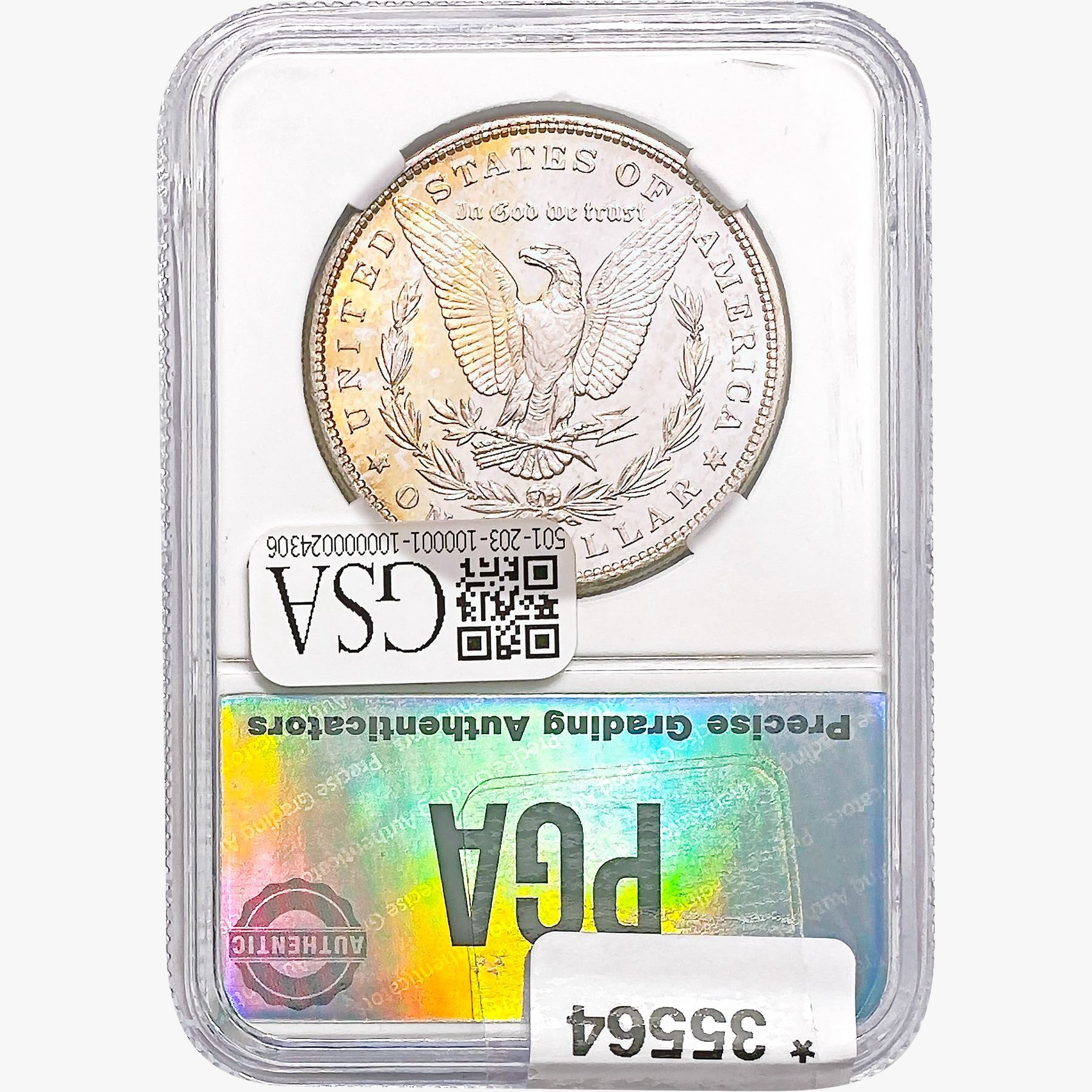 COINS AND CURRENCY LISTED IN GSA’S CATALOG AS GRADED AND ENCAPSULATED BY PCGS, NGC, ANACS, ICG, PCGS CURRENCY, PMG, PCGS BANKNOTE GRADING, CMC OR ANY OTHER THIRD-PARTY GRADING SERVICE ARE LIKEWISE SOLD “AS-IS” EXCEPT AS EXPRESSLY SET FORTH HEREIN. ALL THIRD-PARTY GRADING SERVICE GUARANTEES, INCLUDING AUTHENTICITY, ARE THE SOLE RESPONSIBILITY OF THE THIRD-PARTY GRADING SERVICE AND NOT WARRANTIES OR GUARANTEES OF GSA. BIDDERS SHOULD CONTACT THESE THIRD-PARTY GRADING SERVICES DIRECTLY WITH RESPECT TO ANY CLAIMS OR QUESTIONS THEY MAY HAVE CONCERNING THEIR GUARANTEES AND WARRANTIES. BIDDERS ACKNOWLEDGE AND AGREE THAT AUCTIONEER IS NOT BOUND BY OR LIABLE FOR ANY OPINION OR CERTIFICATION BY ANY THIRD-PARTY GRADING SERVICE. REMOVAL OF A PRODUCT FROM ITS PROTECTIVE CASING OR HOLDER OR ALTERATION OF ANY COIN HOLDER WAIVES ALL RIGHTS CONCERNING THE PRODUCT CONTAINED THEREIN.